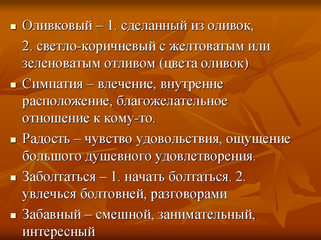 Оливковый – 1. сделанный из оливок,2. светло-коричневый с желтоватым или