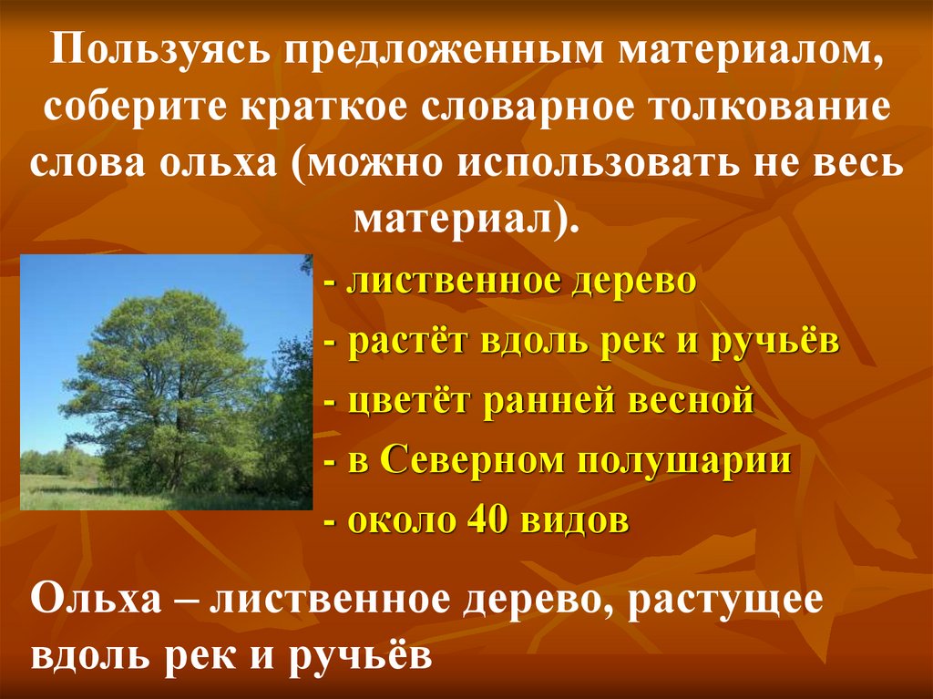 слова ольха (можно использовать не весь