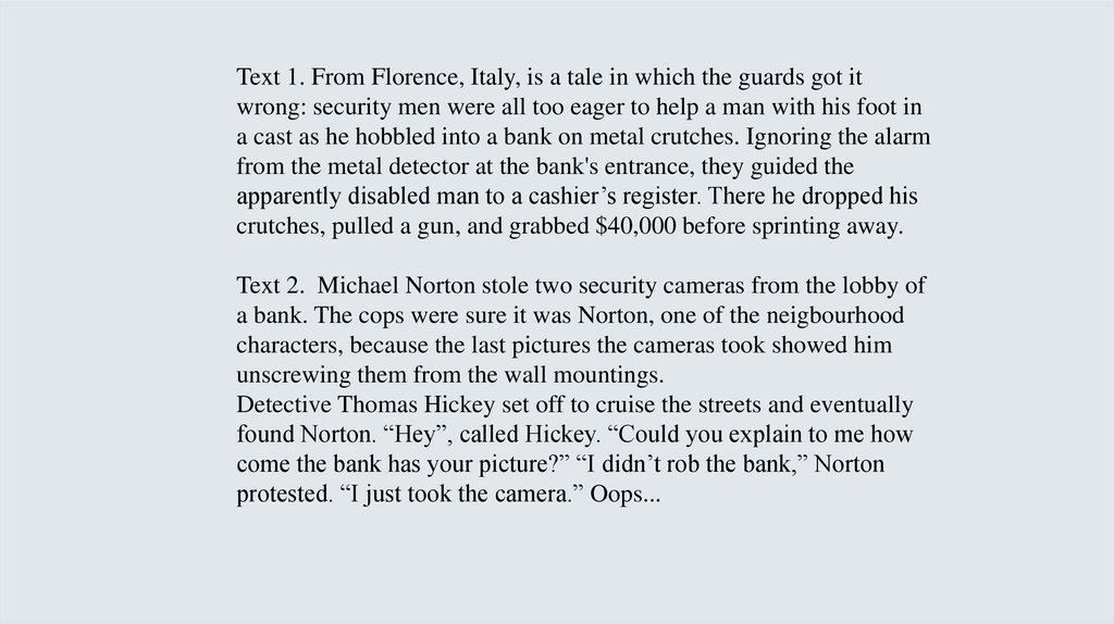 Text 1. From Florence, Italy, is a tale in which the guards got itwrong: security men were all too eager to help a man with his foot in