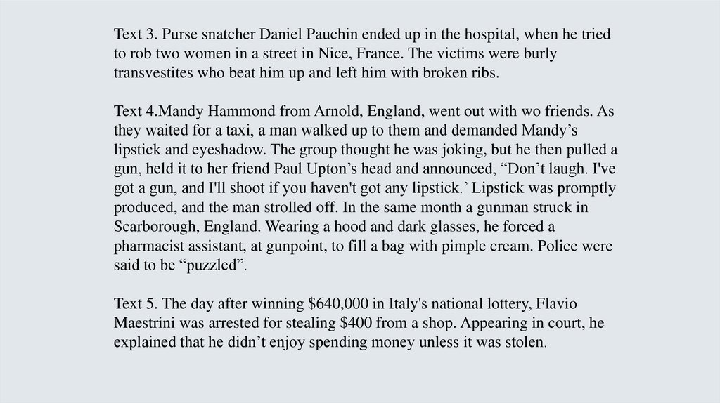 Text 3. Purse snatcher Daniel Pauchin ended up in the hospital, when he triedto rob two women in a street in Nice, France. The victims were burly