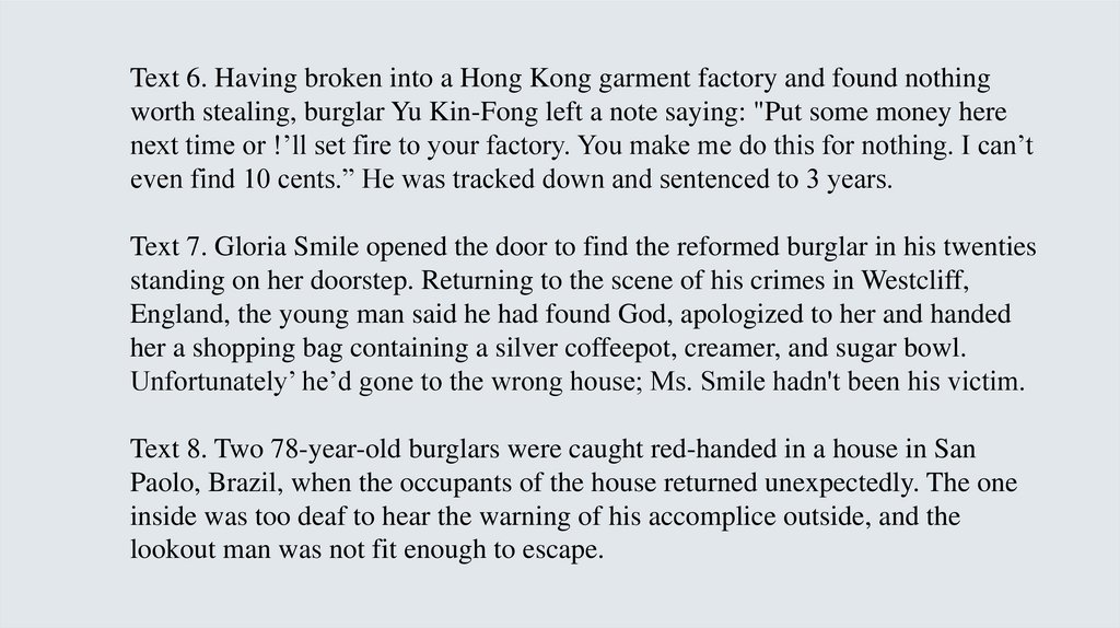Text 6. Having broken into a Hong Kong garment factory and found nothingworth stealing, burglar Yu Kin-Fong left a note saying: "Put some money here