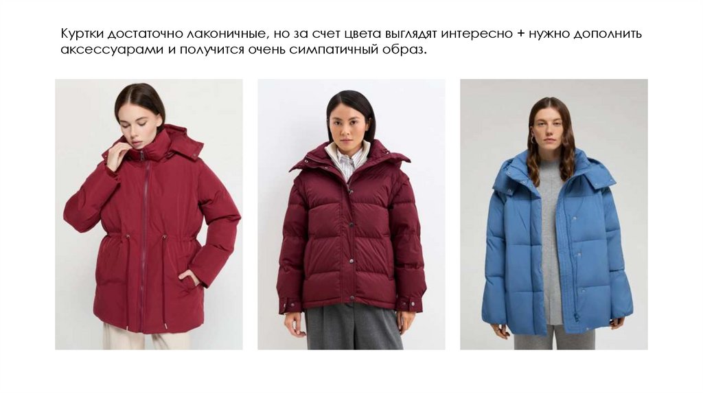 Куртки достаточно лаконичные, но за счет цвета выглядят интересно + нужно дополнитьаксессуарами и получится очень симпатичный образ.