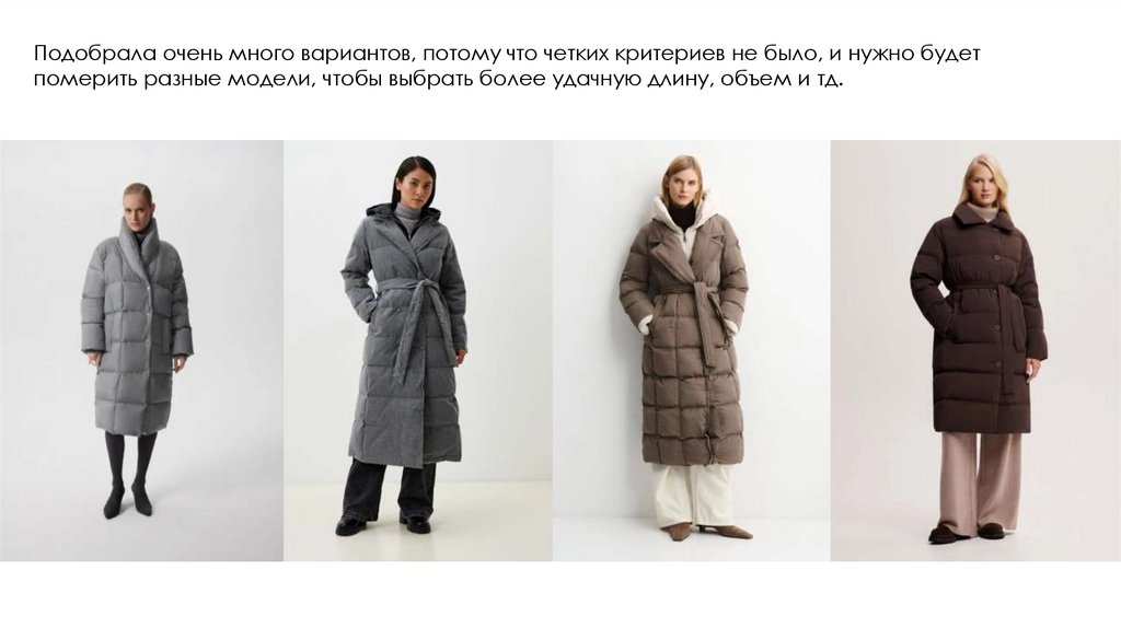 Подобрала очень много вариантов, потому что четких критериев не было, и нужно будетпомерить разные модели, чтобы выбрать более удачную длину, объем и тд.