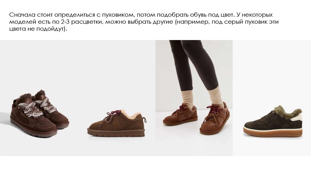 Сначала стоит определиться с пуховиком, потом подобрать обувь под цвет. У некоторыхмоделей есть по 2-3 расцветки, можно выбрать другие (например, под серый пуховик эти