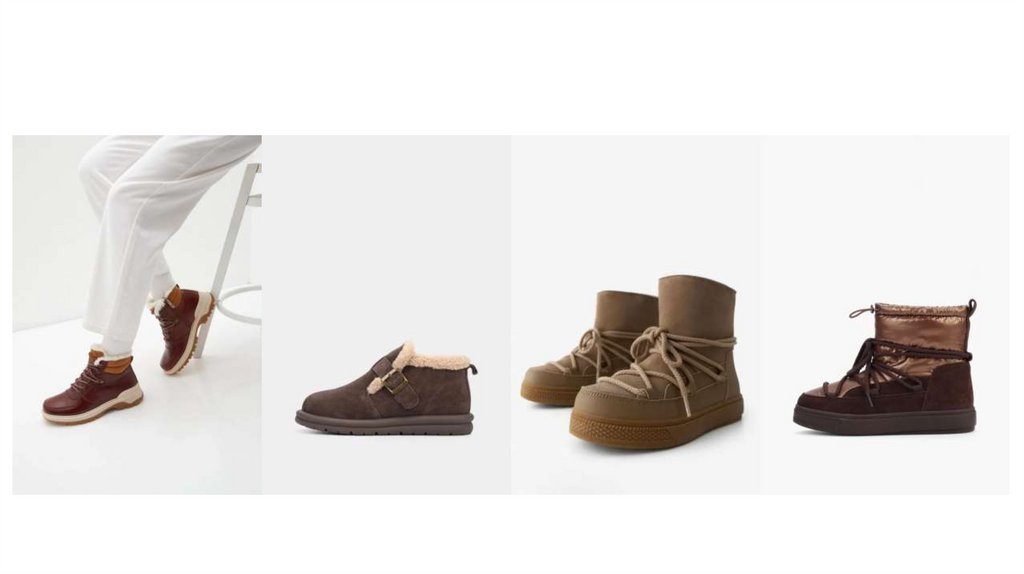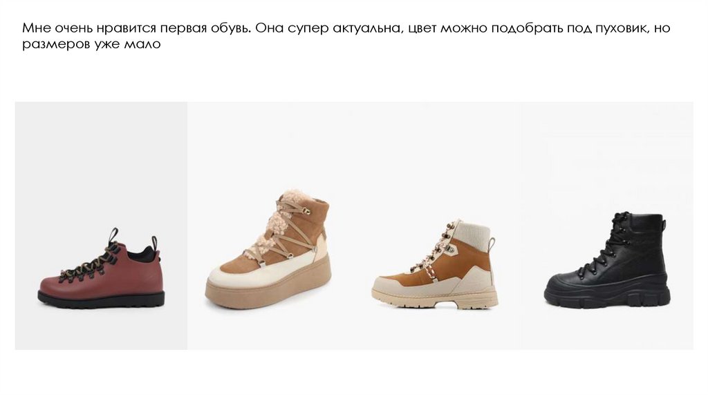 Мне очень нравится первая обувь. Она супер актуальна, цвет можно подобрать под пуховик, норазмеров уже мало