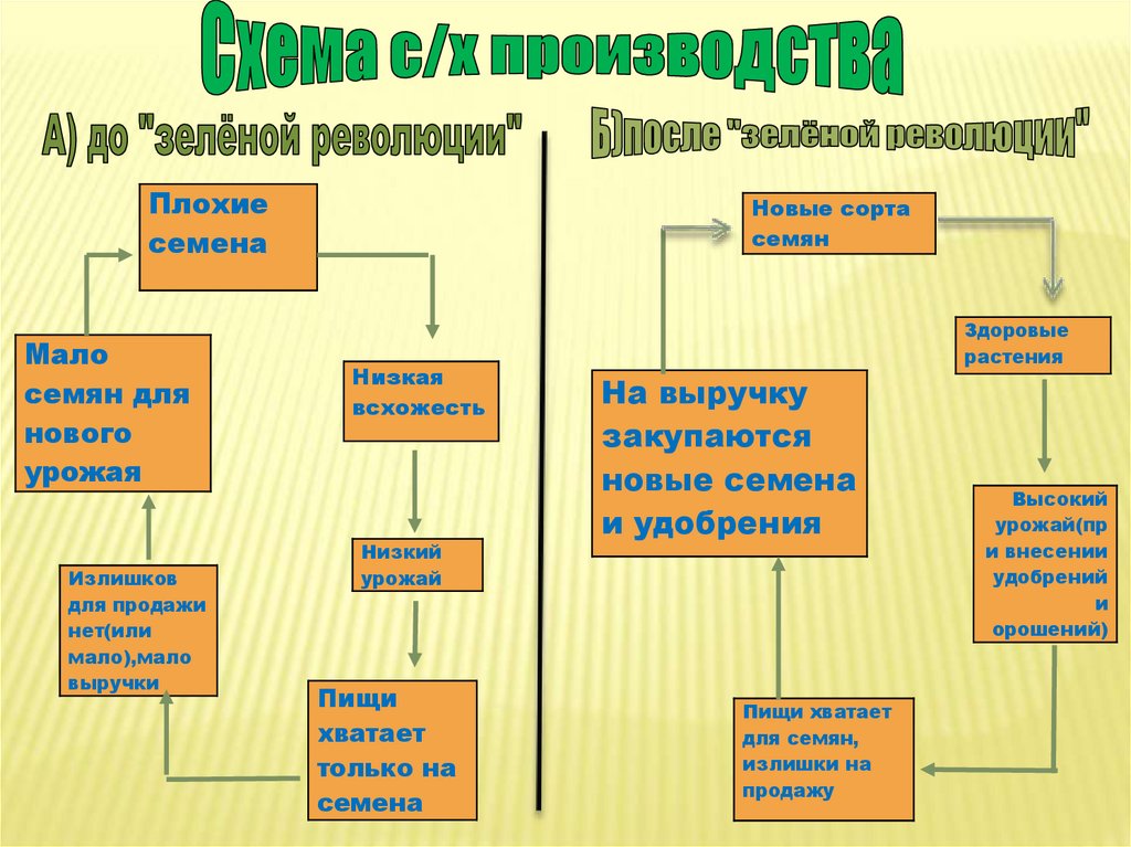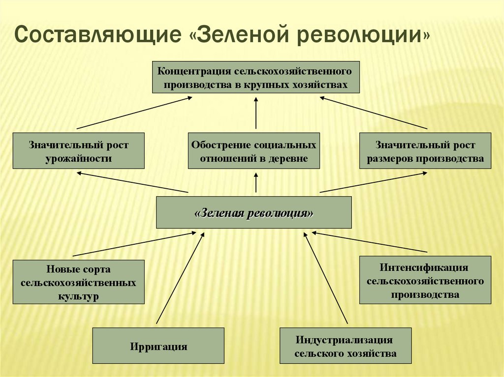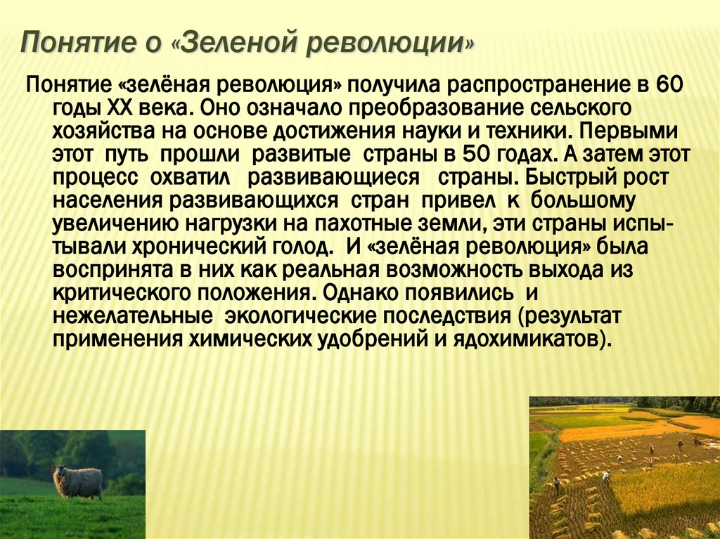 Понятие «зелёная революция» получила распространение в 60годы ХХ века. Оно означало преобразование сельского