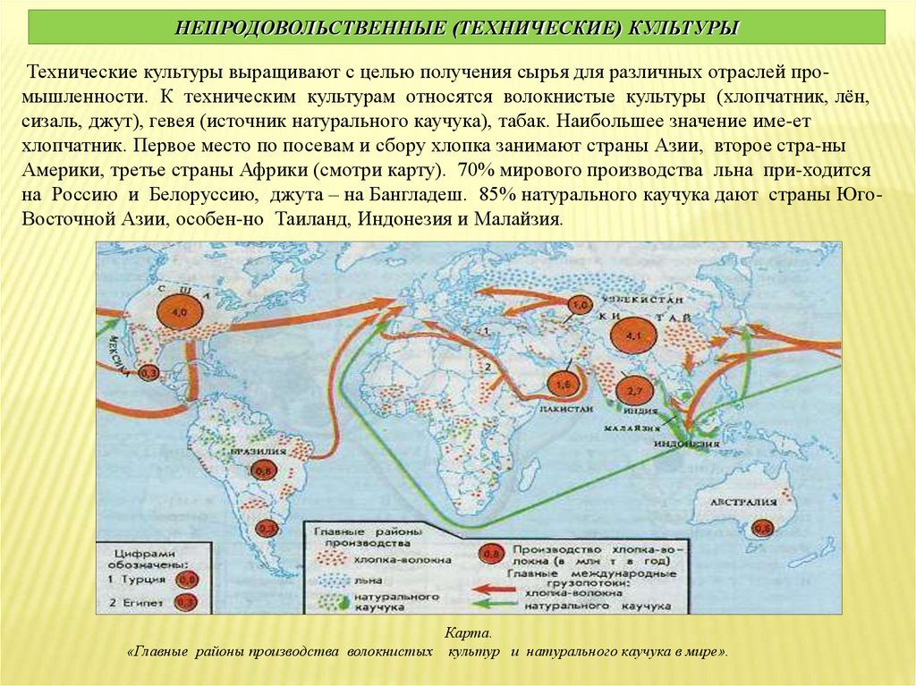 на Россию и Белоруссию, джута – на Бангладеш. 85% натурального каучука дают страны ЮгоВосточной Азии, особен-но Таиланд, Индонезия и Малайзия.