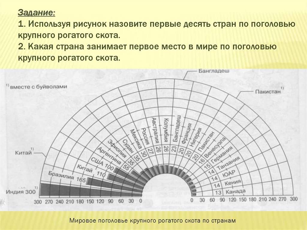 19. Задание: 1. Используя рисунок назовите первые десять стран по поголовью крупного рогатого скота. 2. Какая страна занимает