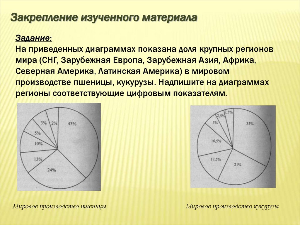 производстве пшеницы, кукурузы. Надпишите на диаграммах