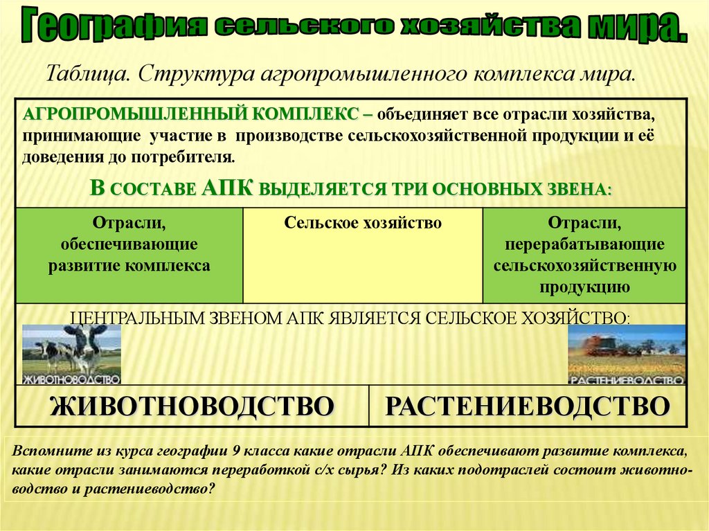 Вспомните из курса географии 9 класса какие отрасли АПК обеспечивают развитие комплекса,