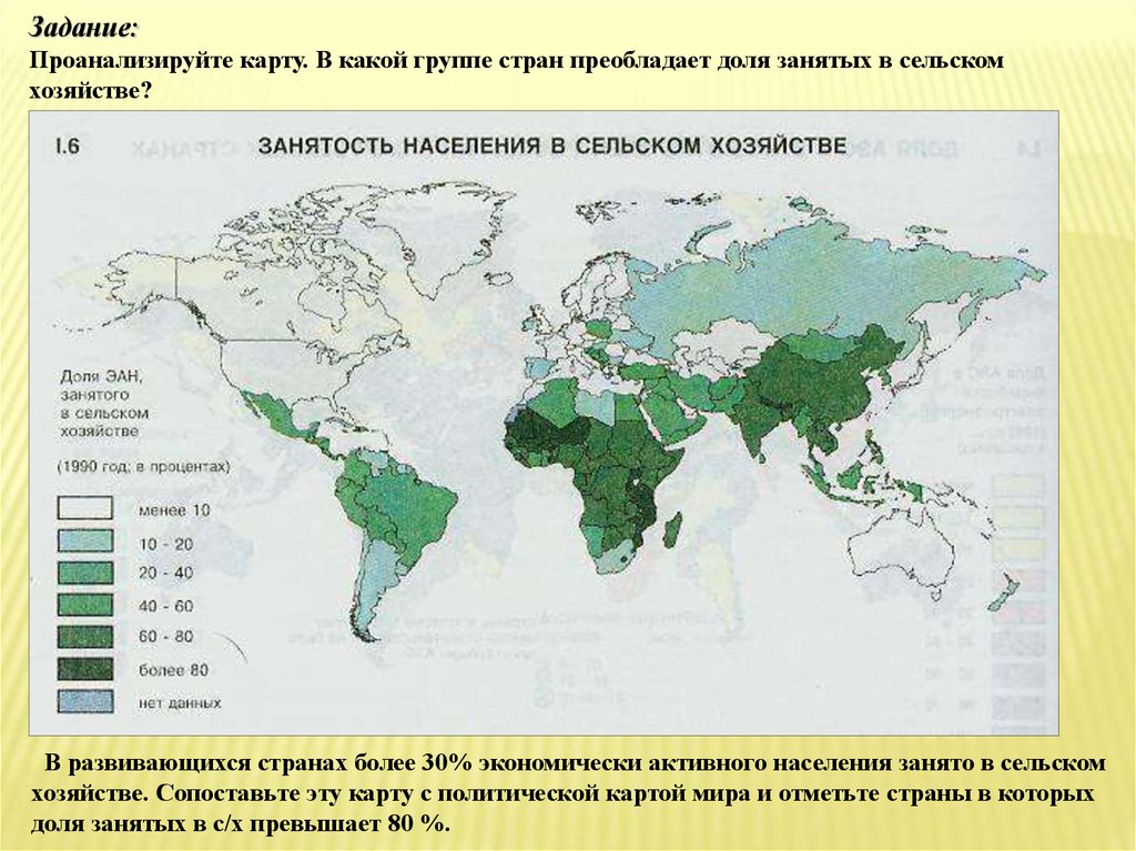 Задание:Проанализируйте карту. В какой группе стран преобладает доля занятых в сельском
