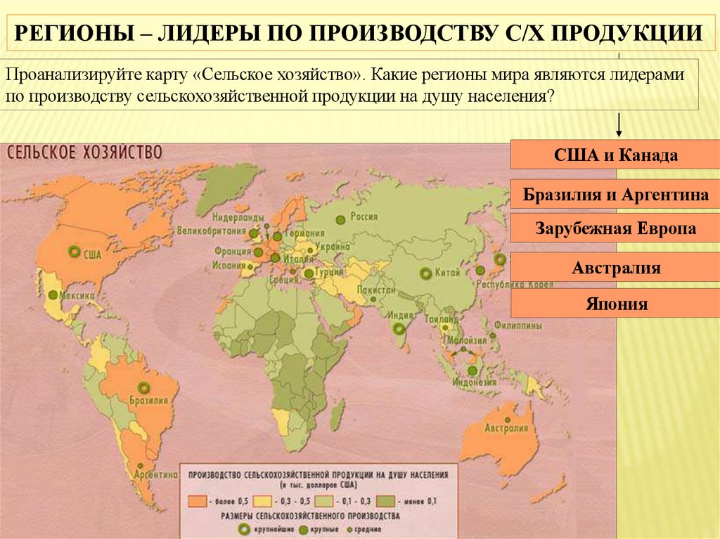 РЕГИОНЫ – ЛИДЕРЫ ПО ПРОИЗВОДСТВУ С/Х ПРОДУКЦИИПроанализируйте карту «Сельское хозяйство». Какие регионы мира являются лидерами
