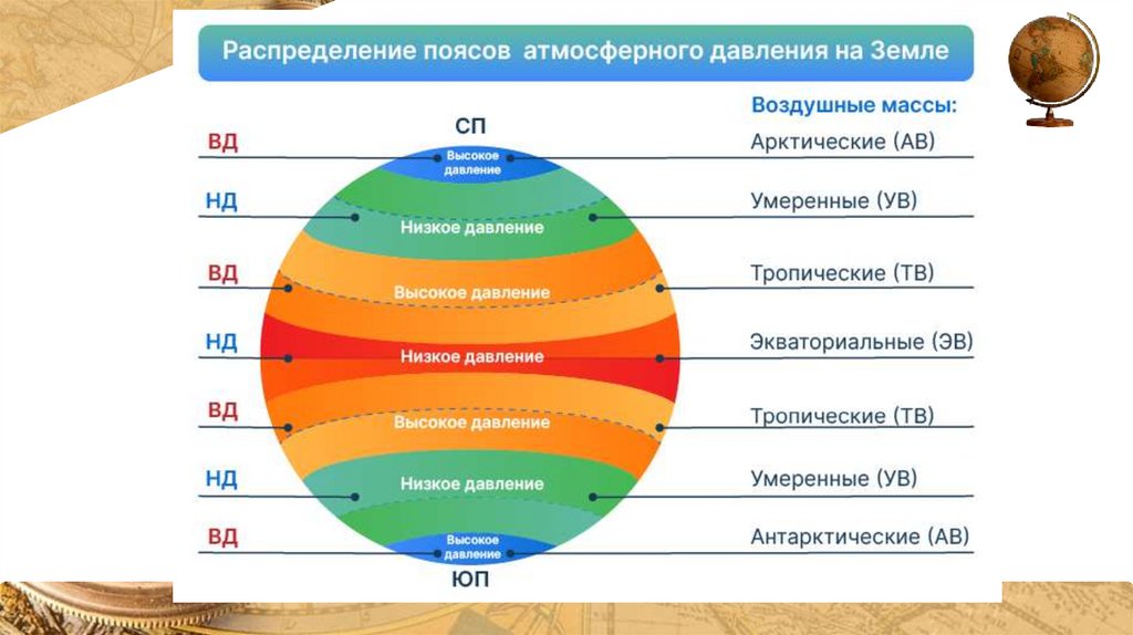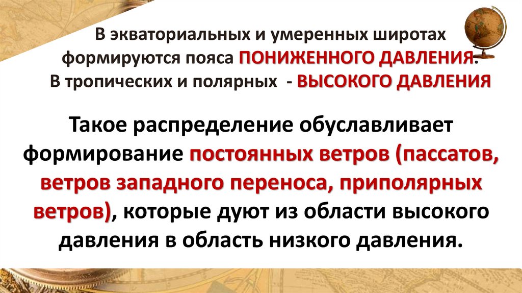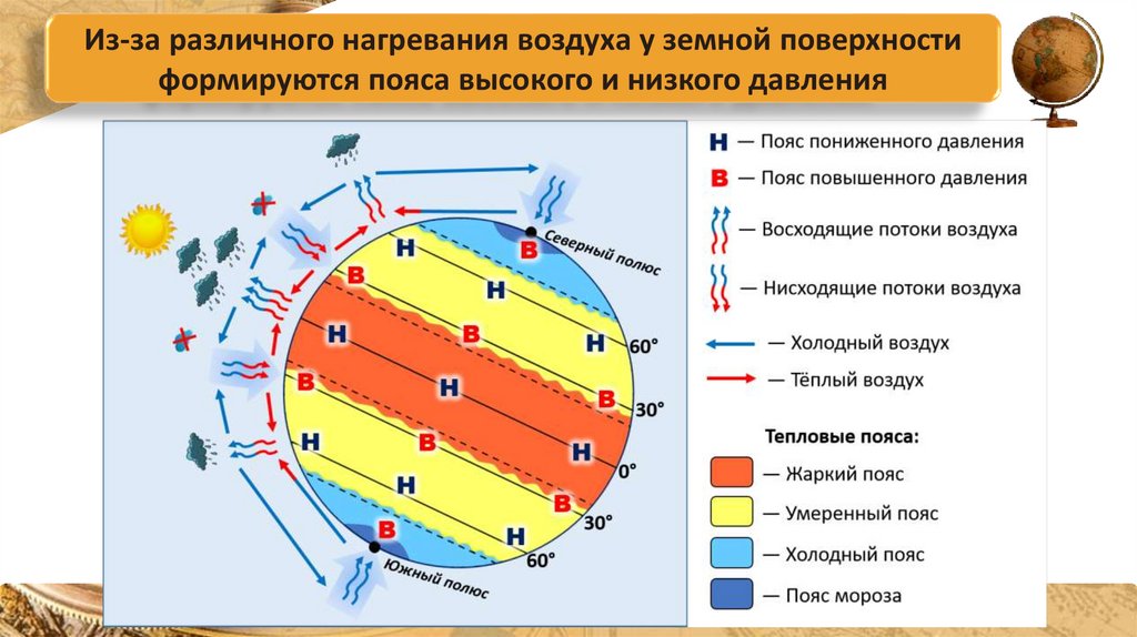 Из-за различного нагревания воздуха у земной поверхностиформируются пояса высокого и низкого давления