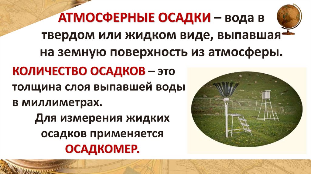 АТМОСФЕРНЫЕ ОСАДКИ – вода втвердом или жидком виде, выпавшая
