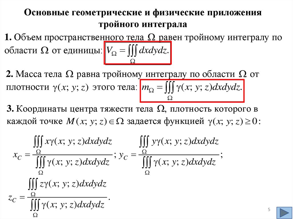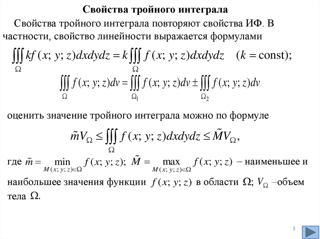 Свойства тройного интегралаСвойства тройного интеграла повторяют свойства ИФ. В