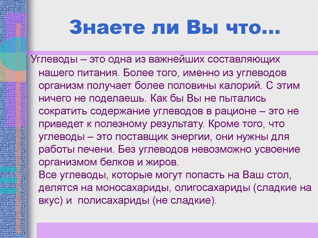 В 1 г углеводов содержится 4,1 калория энергии. Если употреблять