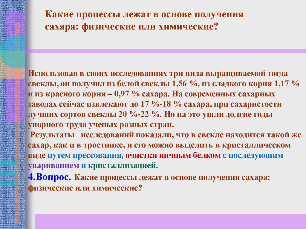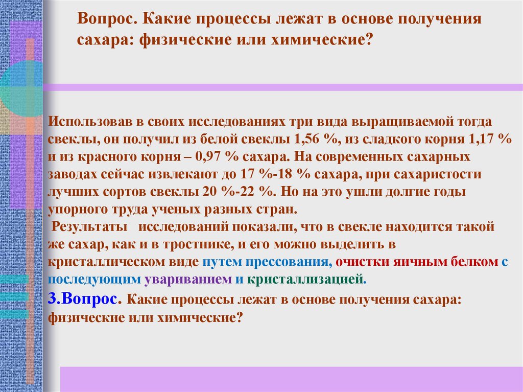 Вопрос. Какие процессы лежат в основе получениясахара: физические или химические?