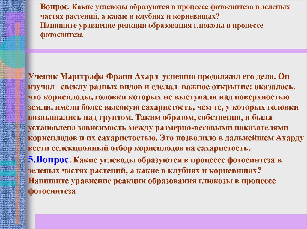 4.Вопрос. Какие процессы лежат в основе получения сахара:
