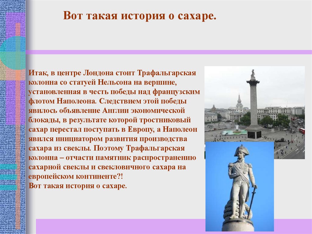 Вот такая история о сахаре.Итак, в центре Лондона стоит Трафальгарская
