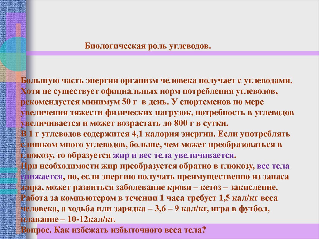 Биологическая роль углеводов.Большую часть энергии организм человека получает с углеводами.