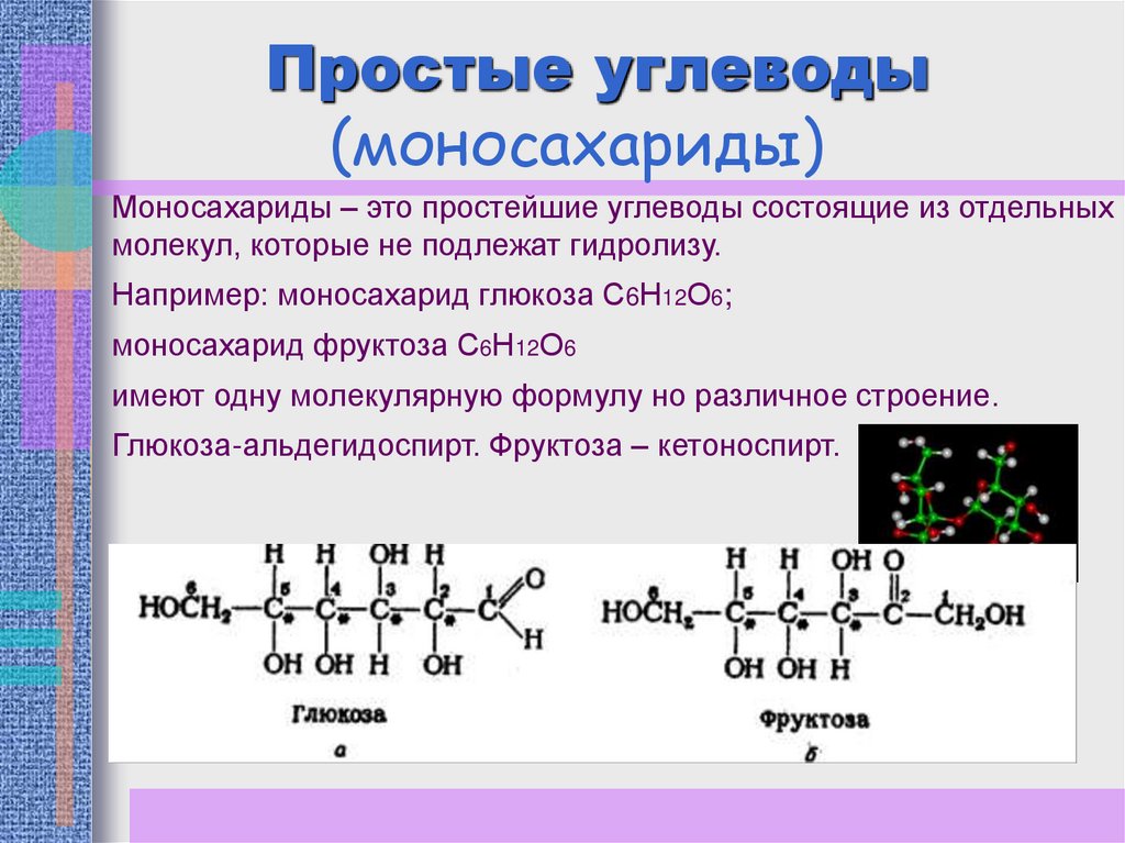 Моносахариды – это простейшие углеводы состоящие из отдельныхмолекул, которые не подлежат гидролизу.