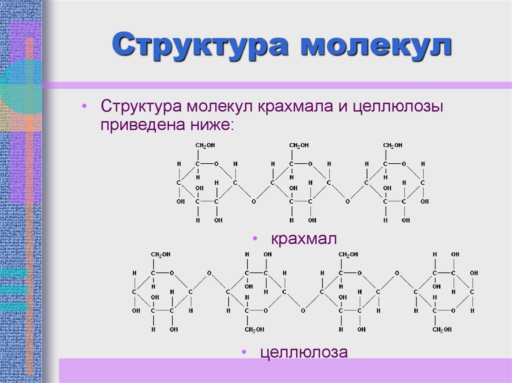Структура молекул• Структура молекул крахмала и целлюлозы