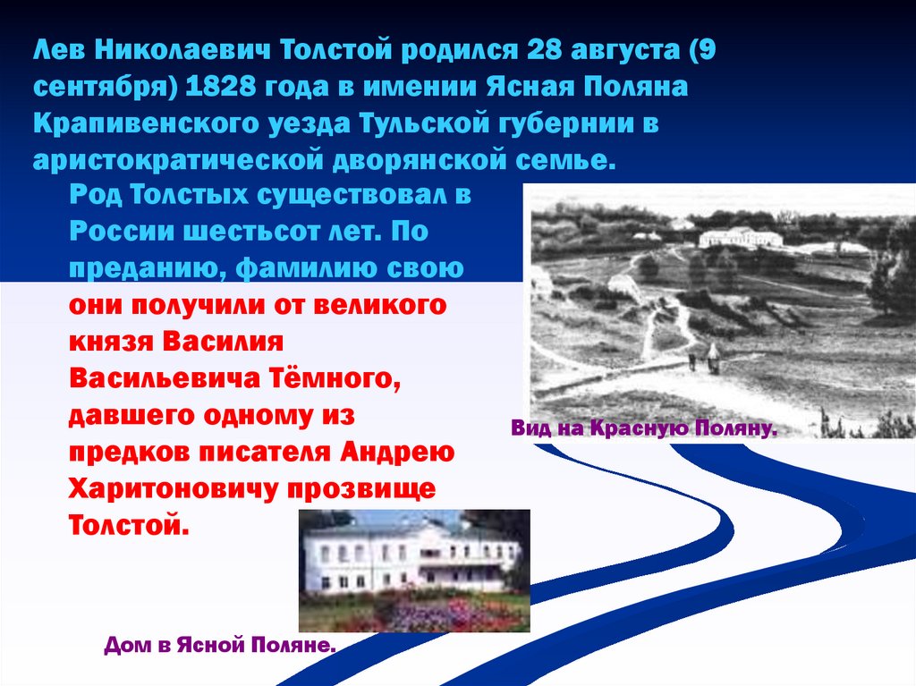 родился в имении Ясная Поляна, Крапивенского уезда, Тульской