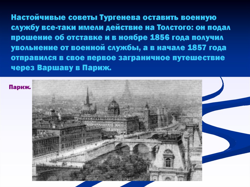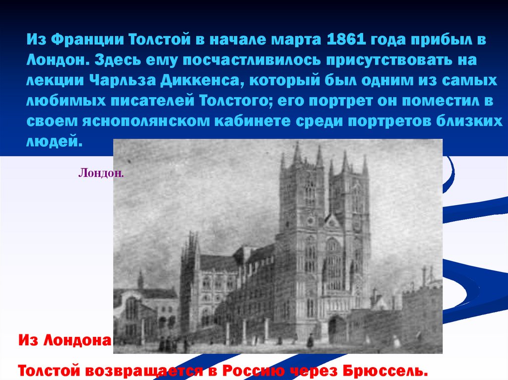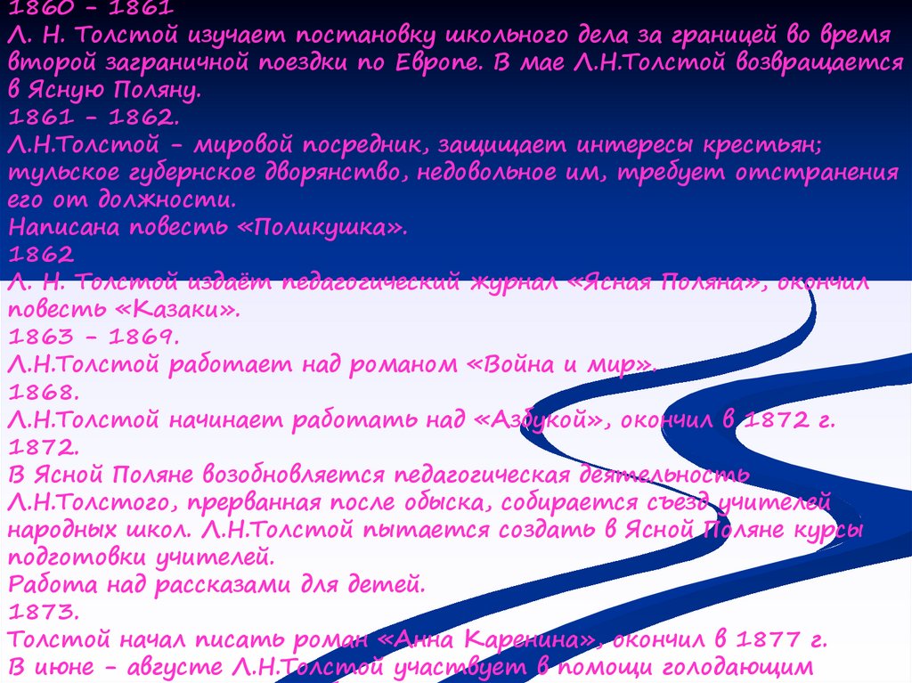1860 - 1861Л. Н. Толстой изучает постановку школьного дела за границей во время
