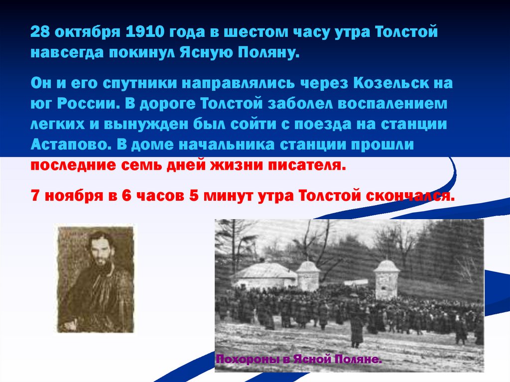 28 октября 1910 года в шестом часу утра Толстойнавсегда покинул Ясную Поляну.