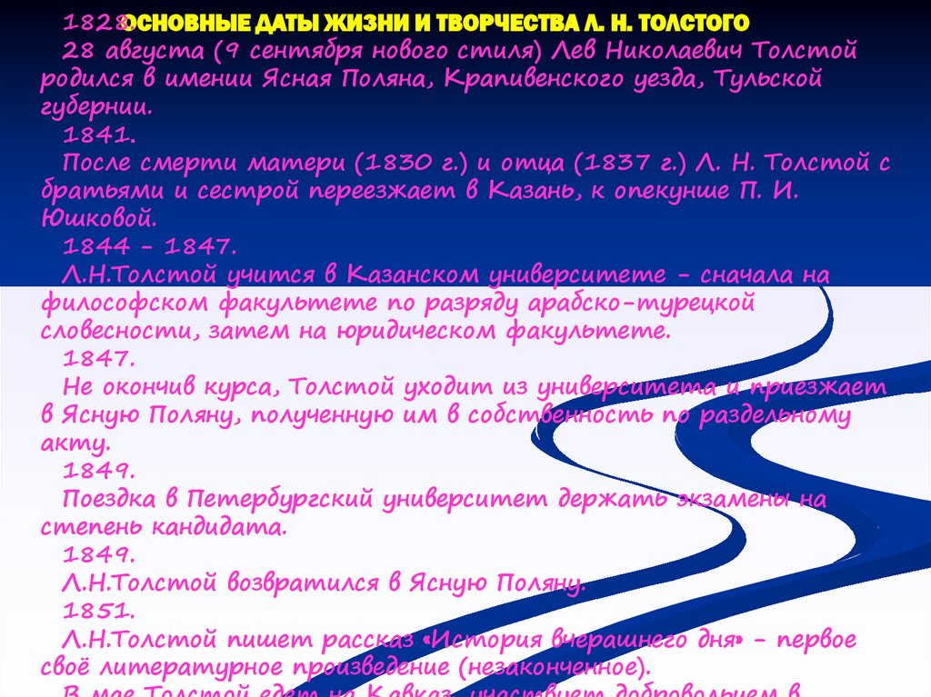 1828.ОСНОВНЫЕ ДАТЫ ЖИЗНИ И ТВОРЧЕСТВА Л. Н. ТОЛСТОГО