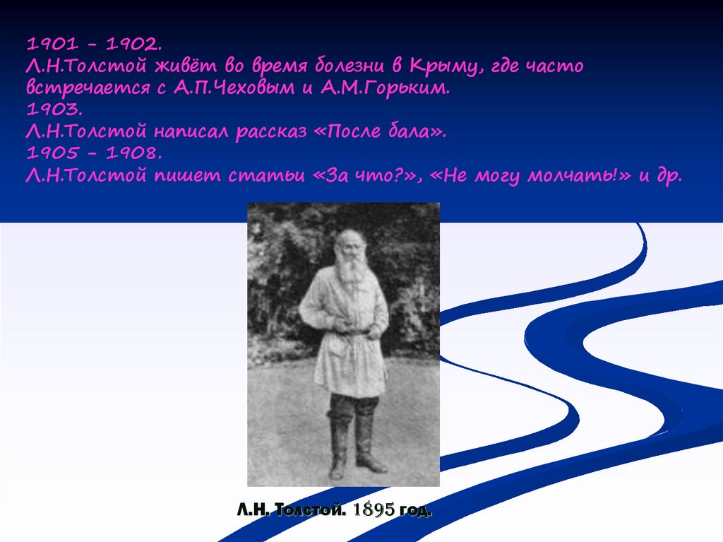 1901 - 1902.Л.Н.Толстой живёт во время болезни в Крыму, где часто