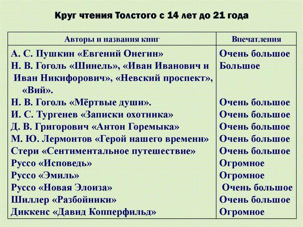 Круг чтения Толстого с 14 лет до 21 годаАвторы и названия книг