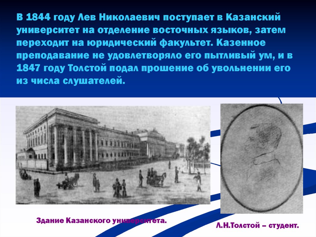 В 1844 году Лев Николаевич поступает в Казанскийуниверситет на отделение восточных языков, затем