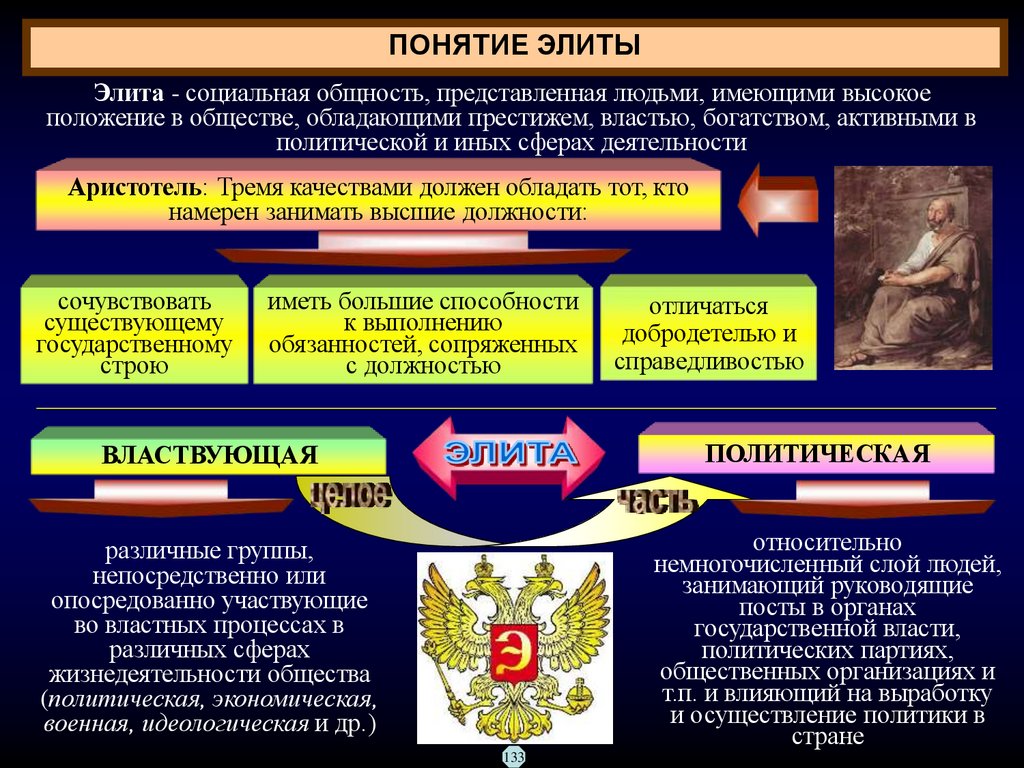ПОНЯТИЕ ЭЛИТЫЭлита - социальная общность, представленная людьми, имеющими высокое