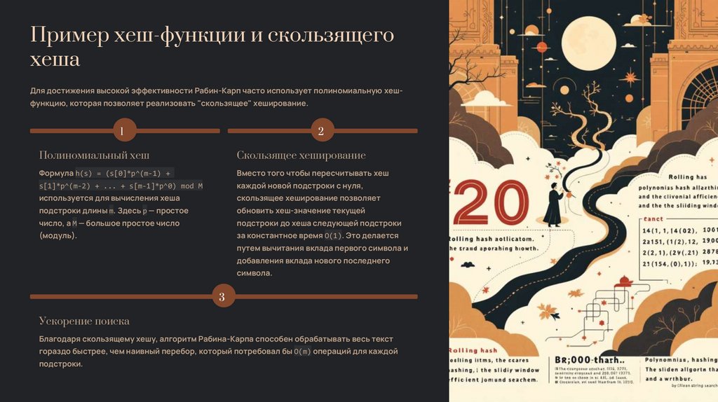 Для достижения высокой эффективности Рабин-Карп часто использует полиномиальную хешфункцию, которая позволяет реализовать "скользящее" хеширование.