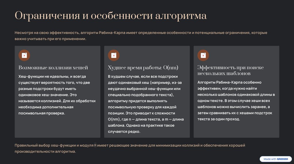 Ограничения и особенности алгоритмаНесмотря на свою эффективность, алгоритм Рабина-Карпа имеет определенные особенности и потенциальные ограничения, которые