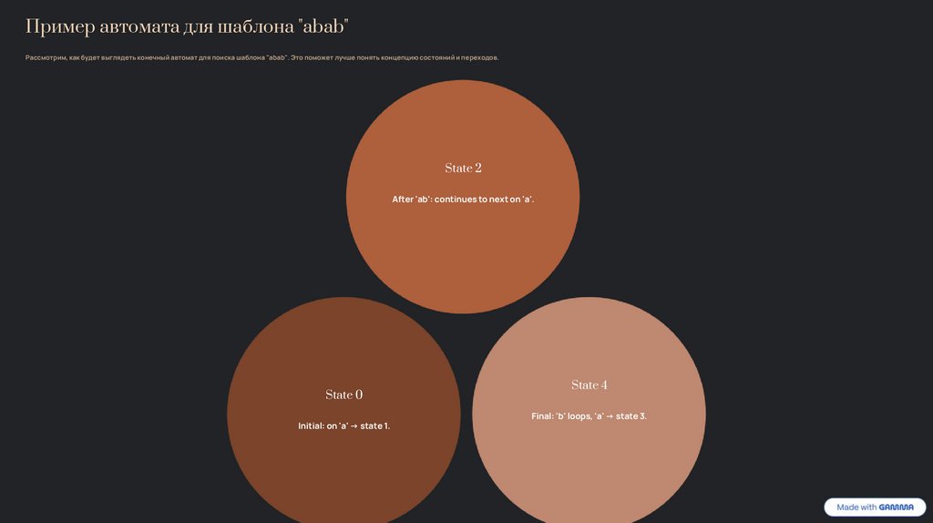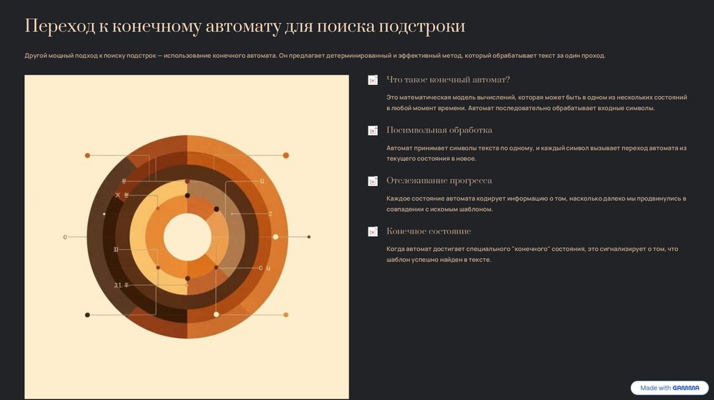 Переход к конечному автомату для поиска подстрокиДругой мощный подход к поиску подстрок — использование конечного автомата. Он предлагает детерминированный и эффективный метод, который обрабатывает текст за один проход.