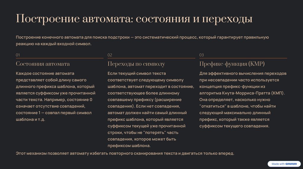 Этот механизм позволяет автомату избегать повторного сканирования текста и двигаться только вперед.