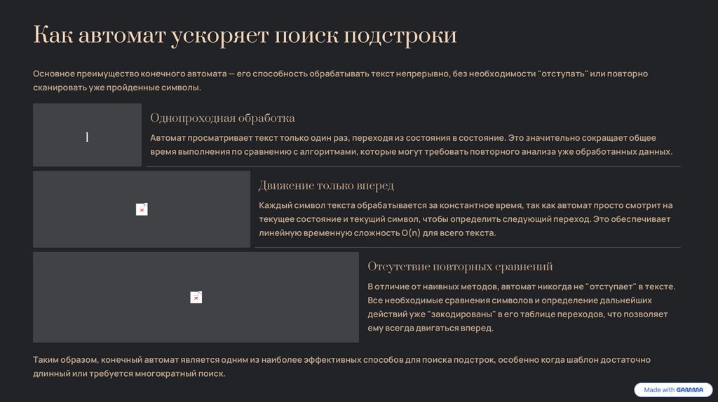 Как автомат ускоряет поиск подстрокиОсновное преимущество конечного автомата — его способность обрабатывать текст непрерывно, без необходимости "отступать" или повторно