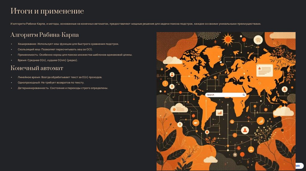 Итоги и применениеИ алгоритм Рабина-Карпа, и методы, основанные на конечных автоматах, предоставляют мощные решения для задачи поиска подстрок, каждое со своими уникальными преимуществами.