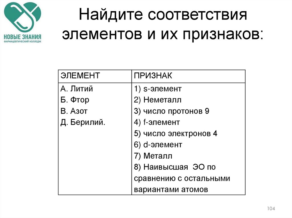104. Найдите соответствия элементов и их признаков: