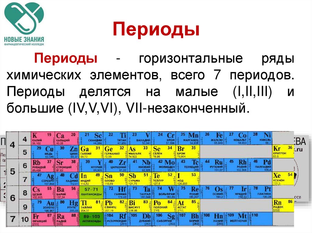 Периоды - горизонтальные рядыхимических элементов, всего 7 периодов.