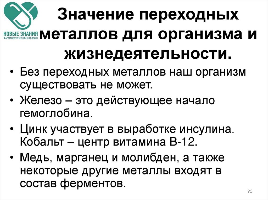 95. Значение переходных металлов для организма и жизнедеятельности.