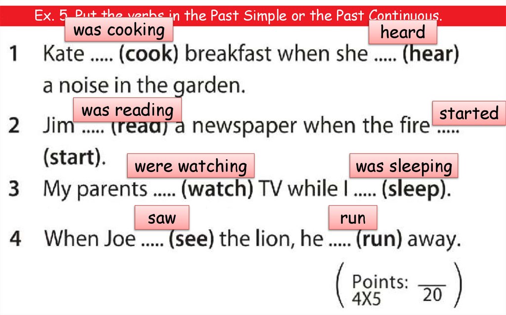 Ex. 5. Put the verbs in the Past Simple or the Past Continuous.was cooking