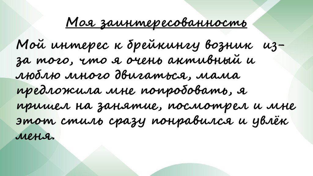 Моя заинтер есованностьМой интер ес к бр ейкингу возник изза того, что я очень активный и