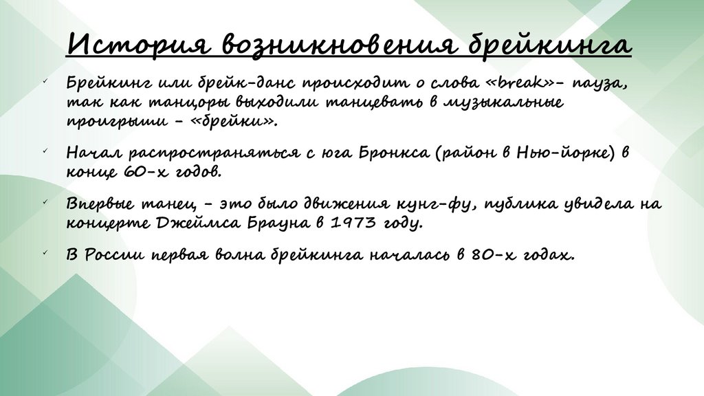 История возникнов ения бр ейкингаБр ейкинг или бр ейк-данс происходит о слова «break»- пауза,