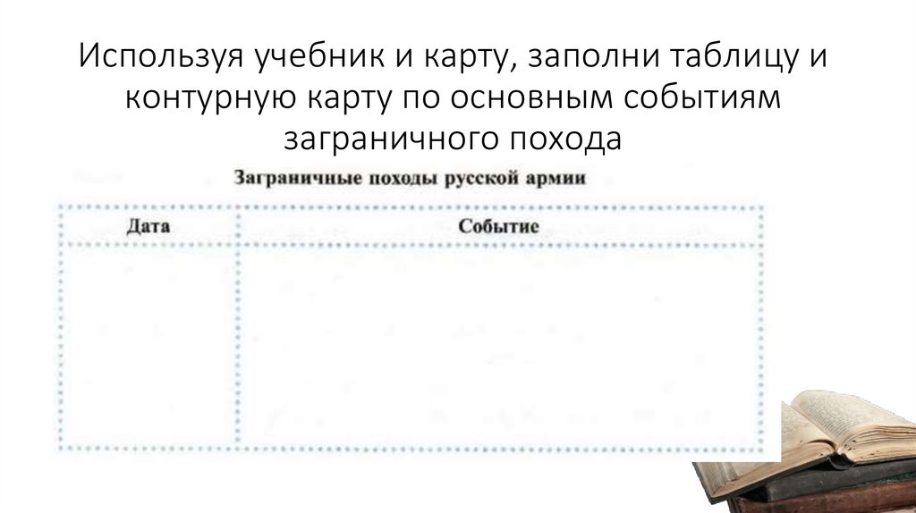 2. Используя учебник и карту, заполни таблицу и контурную карту по основным событиям заграничного похода