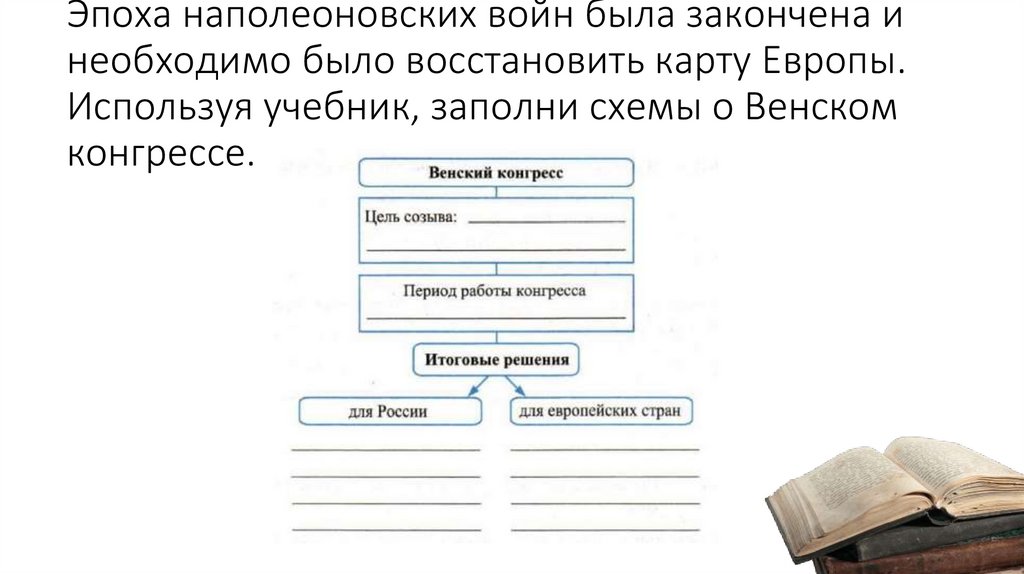 6. Эпоха наполеоновских войн была закончена и необходимо было восстановить карту Европы. Используя учебник, заполни схемы о
