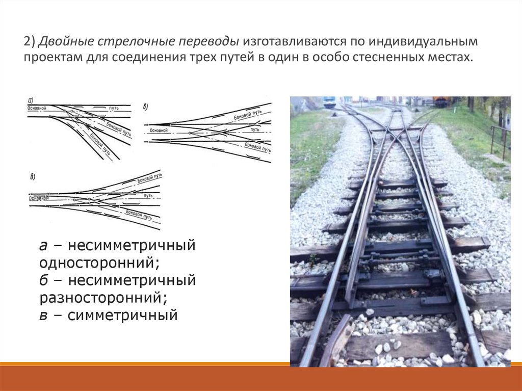 2) Двойные стрелочные переводы изготавливаются по индивидуальнымпроектам для соединения трех путей в один в особо стесненных местах.