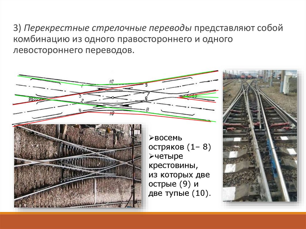3) Перекрестные стрелочные переводы представляют собойкомбинацию из одного правостороннего и одного